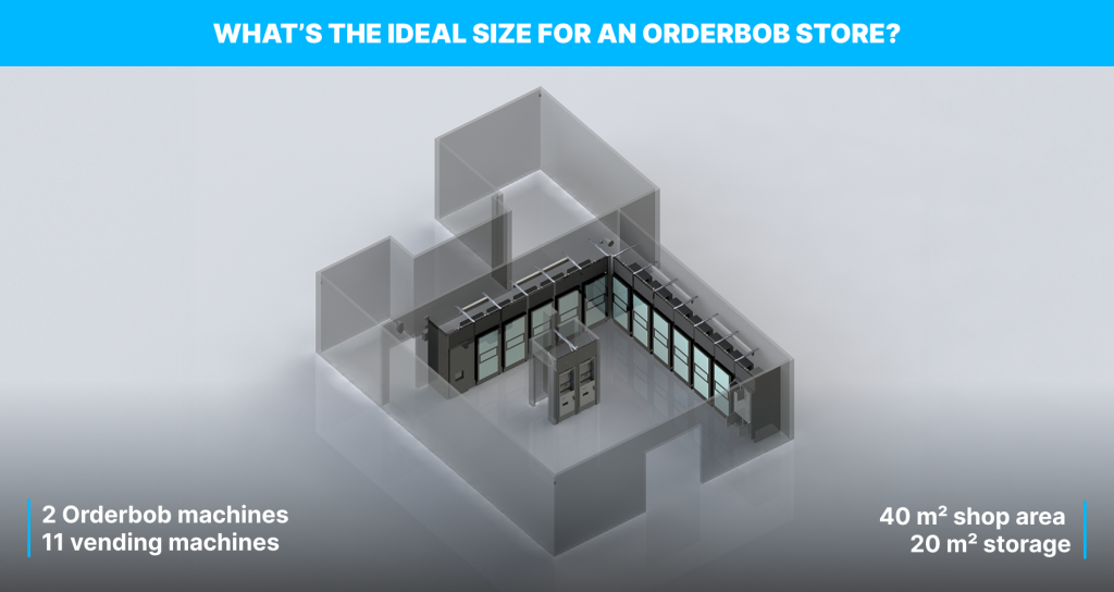 Der Sweet Spot beginnt bei etwa 60 m², mit 40 m² Verkaufsfläche und 20 m² Lager. Ein klares Layout, das Struktur, Übersicht und das komplette Orderbob Erlebnis in einem einzigen Raum vereint.